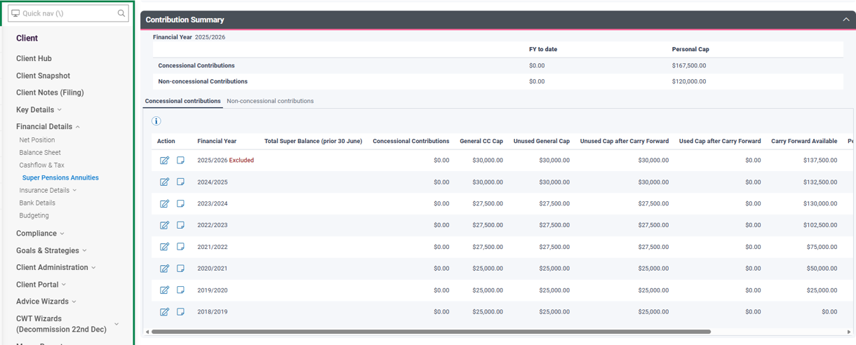 The Summary is now presented in two separate tabs — Concessional and Non‑Concessional — each showing transparent breakdowns of how caps and entitlements are calculated.
