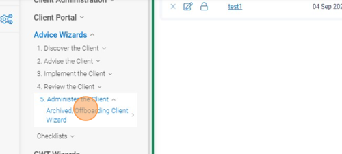 Navigate to Advice Wizards. Select 5. Administer the client and click Archive/Offboarding Client Wizard