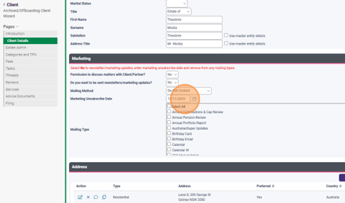 For deceased clients, update the Title to “Estate of [Client Name]”. Ensure all marketing permissions are set to “No” or “Do Not Contact” as per licensee standards. Untick all mailing types to prevent accidental future correspondence.